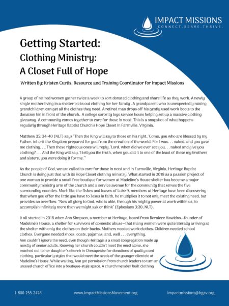 At Heritage Baptist Church in Farmville, Virginia, the Hope Closet is more than a place to get free clothes. It’s a place where needs are met, community is formed and engaged, and hope is quietly offered—one garment, one conversation, one family at a time.