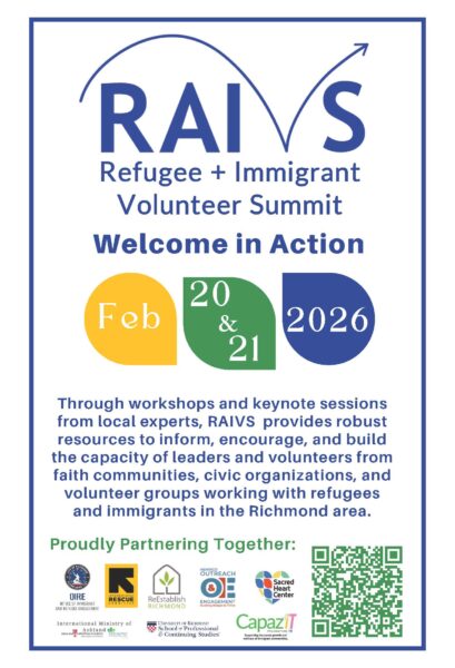 Through workshops and keynote sessions from local experts, RAIVS provides robust resources to inform, encourage, and build the capacity of leaders and volunteers from faith communities, civic organizations, and volunteer groups working with refugees and immigrants in the Richmond area.
