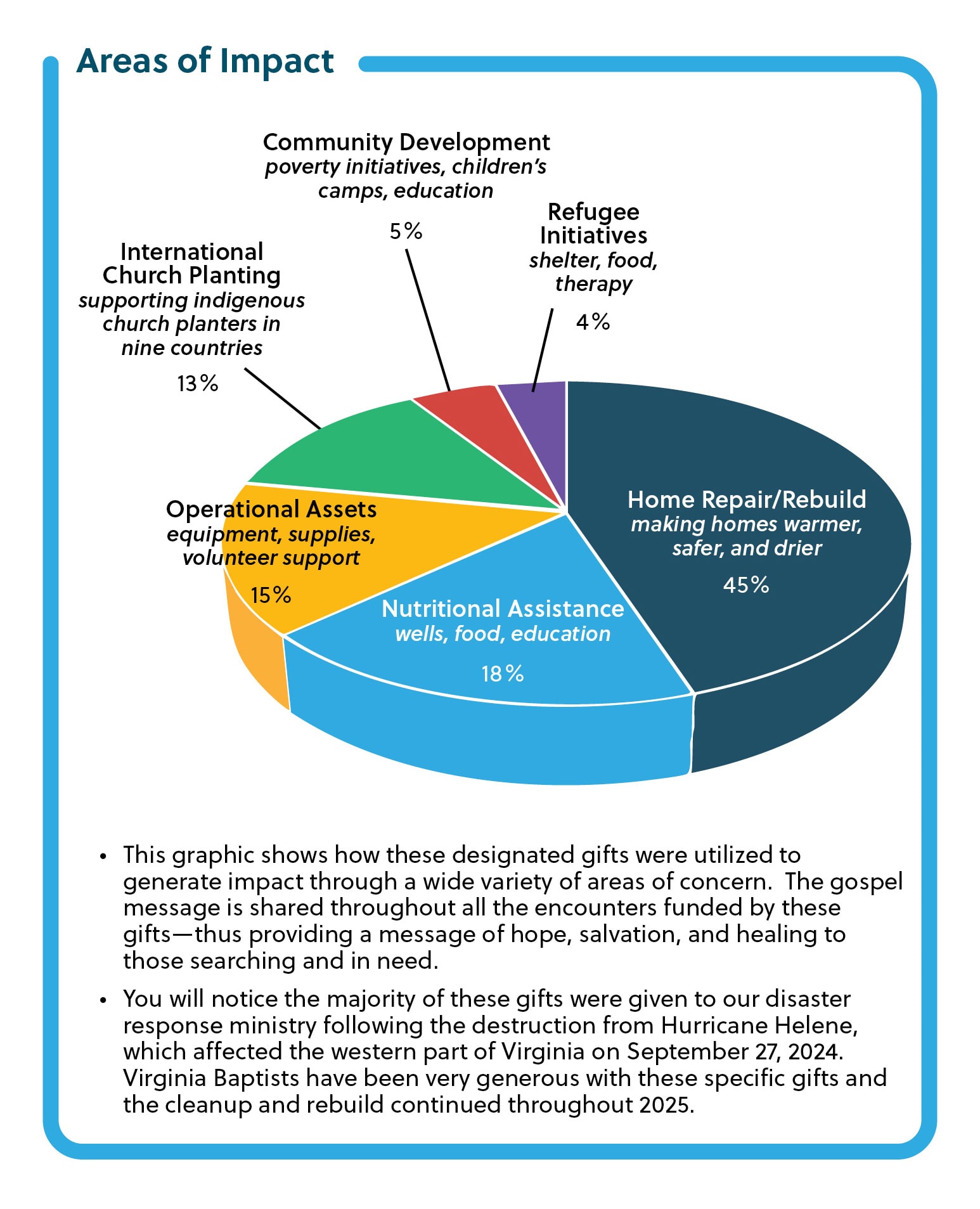 - You will notice that the majority of these gifts were given to our disaster response ministry following the destruction from Hurricane Helene which affected the western part of Virginia on September 27th, 2024. Virginia Baptists have been very generous with these specific gifts and the clean-up and rebuild continued throughout 2025.